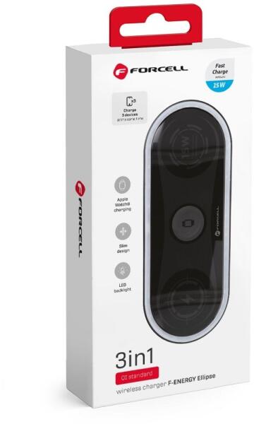 A Forcell F-ENERGY Ellipse 3 az 1-ben vezeték nélküli töltő egy megbízható és sokoldalú eszköz, amely lehetővé teszi az okostelefon, az óra és a TWS fülhallgató egyidejű töltését anélkül, hogy több kábelre lenne szükség. Támogat minden mobil eszközt, amely megfelel a Qi szabványnak. Kompatibilis Apple termékekkel, mint például iPhone, Apple Watch és AirPods. A hár
