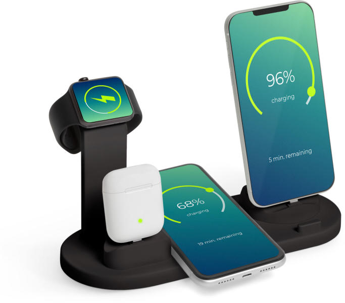 - Vezeték nélküli töltésfunkció MicroUSB, Type-C, Lightning és USB-A töltőcsatlakozókkal - Rejtett kábelvezető csatorna - Kellemes tapitású, strapabíró műanyagból - Fehér design Multifunkciós töltőállomás, amely segítségével bármilyen ma használatos mobileszköz feltölthető! A készülék 6 db töltőcsatlakozóval rendelkezik, amelyek között megtalálható a vezet