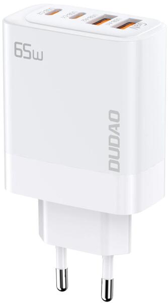 Dudao A65EU GaN hálózati töltő 2x USB-A és 2x USB-C csatlakozóval, akár 65W teljesítménnyel (PD kompatibilis) - fehér A Dudao A65EU GaN töltő hatékony és biztonságos módja négy eszköz egyidejű töltésére. A GaN technológiának köszönhetően a készülék kisebb méretű, de nagyobb teljesítményt nyújt, lehetővé téve a gyors töltést akár 65W teljesítménnyel. A be
