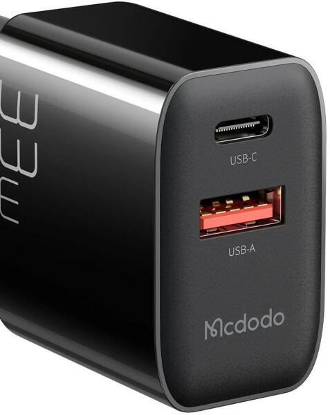 GaN 33W mains charger Mcdodo CH-0921 USB-C, USB-A (black). Introducing the Mcdodo CH-0921 power charger, which combines modern technology and performance. With two outputs - USB-C and USB-A - it provides charging with a maximum power of 33W, allowing you to quickly charge two different devices at the same time. Versatile use The Mcdodo charger's unlimited capabilities include a wide range of input