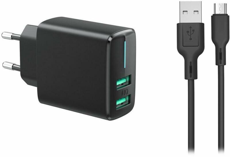 Hálózati töltő 2 x USB-A kimenettel, LED diódával. Gyors töltés. Tápellátás 230V Kimenet 1 DC 5V-2.4A Kimenet 2 DC 5V-1A Szín: feketeKÁBEL: USB A 2.0 / Micro-USB Gyors töltés és adatátvitel. Hossz: 1m. Jelenlegi kapacitás: 2,4A Támogatja a gyors töltést Adatátvitel akár 480 Mbps sebességgel Szín: fekete