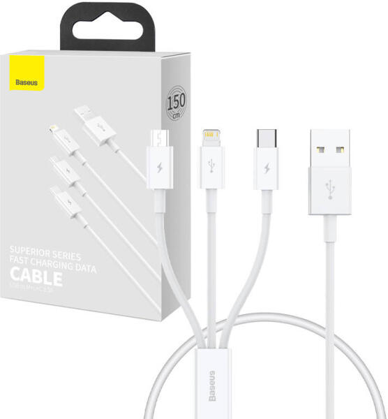 Baseus Superior Data USB és M L C 3.5A 0.5M (fehér) gyors töltő kábel Egy kábel az összes eszközöd töltéséhez, függetlenül attól, hogy milyen csatlakozót támogatnak? Miért ne! A Baseus Superior Data akár 3 csatlakozót is kínál - Micro USB, Lightning és USB-C, olyan kompatibilitást biztosítva, amilyet még sosem ismertél! 3,5 amper töltőáram, 480 Mbps átviteli sebessé