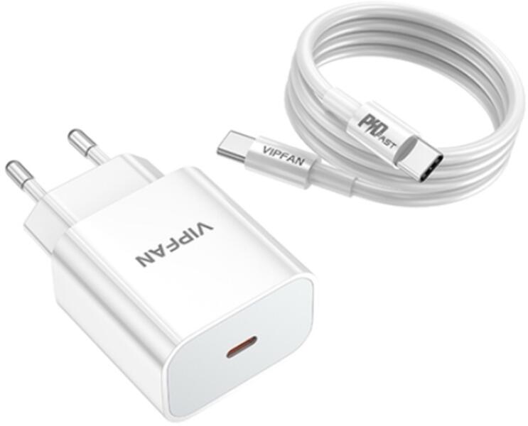 Vipfan E4S - Fehér Type-C (USB-C) hálózati töltőfej + Type-C / Type-C kábel, 20W teljesítménnyel. A kábel hossza 1 méter.