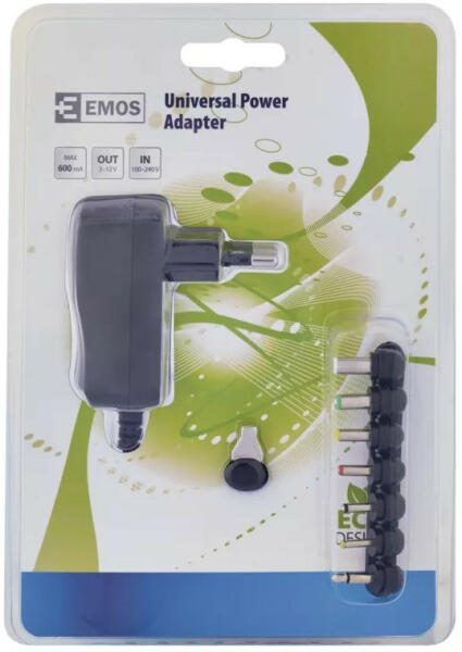 EMOS N3110 univerzális adapter melynek kimeneti feszültsége változtatható: 3 V, 4,5 V, 5 V, 6 V, 7,5 V, 9 V, 12 V . Bemeneti feszültség: 100–240 V~ 50/60 Hz. Kimeneti áram: max. 600 mA . Max. teljesítmény összesen:5 V/2,0 A/10 W. Túlterhelés, túlfeszültség és rövidzárlat elleni védelemmel ellátott. Töltőkábel hossza 1,5 m. Méret: 36 × 66 × 30 mm. A csatlakozó mérete
