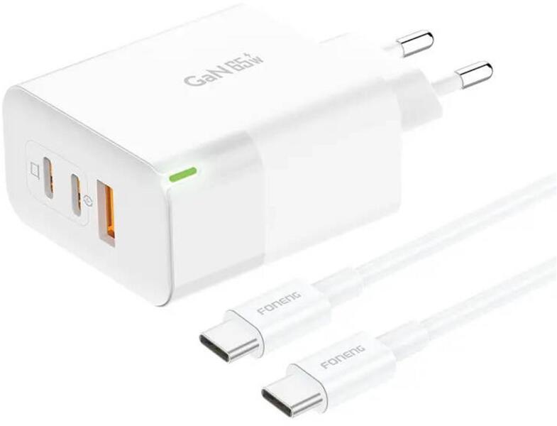 The Foneng GAN65 USB-A, USB-C, USB-C GAN65, 2.4A, 65W (white) Power Charger. Foneng GAN65 is a fast charging charger for users who need more! Equipped with 3 ports ( USB-A and 2xUSB-C), it allows you to replenish 3 devices at the same time. Total power is as much as 65 watts, which means that you will successfully charge not only smaller mobile devices, but also laptops. An example? It only takes