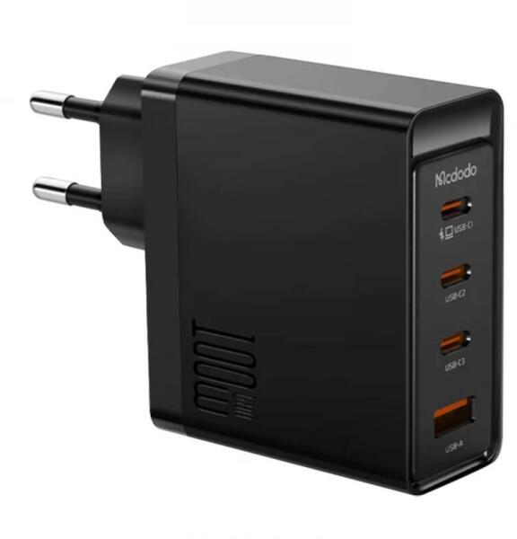 Wall charger McDodo GAN 3xUSB-C + USB, 100W (black) Gain the ability to charge your devices even faster and more conveniently. The McDodo CH-5140 GAN wall charger provides a power output of up to 100W, allowing you to charge even 2 laptops simultaneously. Furthermore, it comes equipped with 4 ports (3x USB-C, 1x USB-A), so you can connect up to 4 devices simultaneously. The product stands out with