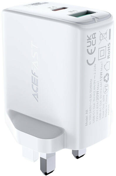 Acefast gyors USB / USB Type C töltő 32W Power Delivery UK Plug (A8 UK) Acefast gyors fali töltő. A brit piacra szánva, UK típusú aljzatokhoz illeszkedik. Összesen 2 porttal rendelkezik, USB Type C és USB. Az első, "C1" feliratú USB Type C csatlakozó 20W maximális teljesítményű töltést tesz lehetővé, az USB A1 csatlakozó pedig 12W-ig. Lehetővé teszi a gyorstöltést, többek