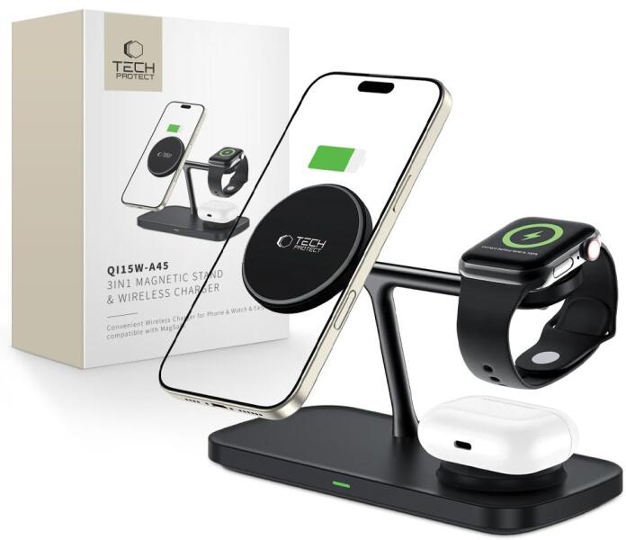 Fedezd fel az új kényelmi szintet a Tech-Protect QI15W-A45 multifunkcionális vezeték nélküli töltővel! Ennek köszönhetően egyszerre vagy teljesen külön töltheted a három kedvenc eszközödet: MagSafe funkcióval rendelkező okostelefont, AirPods-okat és Apple Watch-ot. Az elegáns, matt kivitelű design tökéletesen illeszkedik a modern belső terekbe. Moduláris kialakítása leh