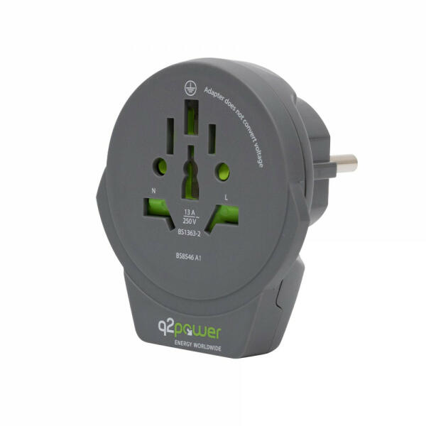 Európába utazik és nem akar bajlódni a töltők és adapterek sokaságával? A q2power 1.100110-TH utazóadapter a megoldás. Ez az innovatív adapter lehetővé teszi, hogy az AUS/CHINA, IT, UK, CH, BRAZIL, USA, EURO (csak földeletlen) szabványú csatlakozókat a GS szabvány szerinti európai aljzatokba csatlakoztassa. Az extra USB csatlakozóval egyszerűen töltheti mobil eszközeit ané