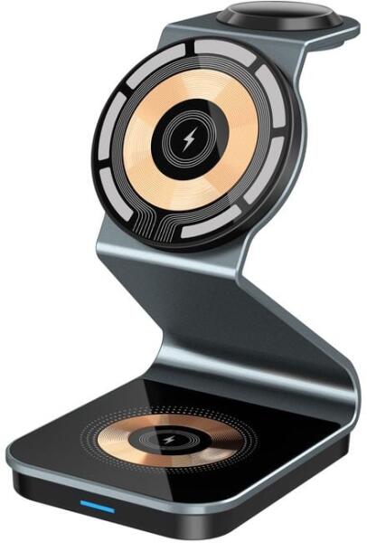 Vezeték nélküli töltő alumíniumötvözetből készült3in1 állvánnyal a vezeték nélküli töltéshez. Ez az átlátszó kialakítású, többfunkciós állvány elegáns és modern megoldást kínál a kompatibilis eszközök töltéséhez. AMagSafe támogatással és 15 W-os vezeték nélküli töltéssel rendelkező állvány ideális az iPhone12 - 15 sorozatú felhasználók, az AirPo