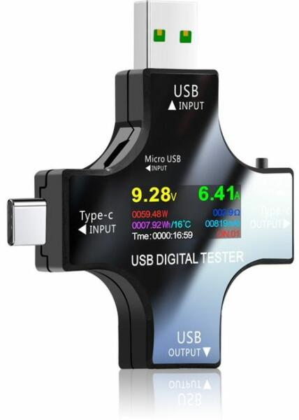 A csatlakoztatott USB-eszköz által felvett feszültség és áram mérésére szolgáló eszköz. A mérő beépített multifunkciós kijelzővel rendelkezik, amelyről leolvasható a kapott áram (amperben) és feszültség (voltban). A készülék előnye a nagyfokú sokoldalúság az USB-A, USB-C és micro USB bemenetnek köszönhetően. Ez a 12 az 1-ben színes multifunkciós kijelzővel ell