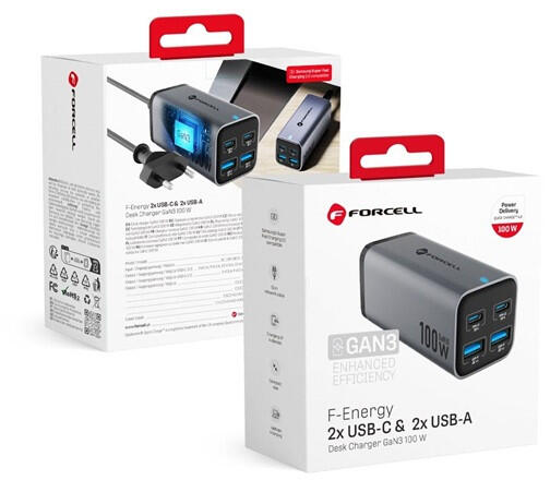 GaN III technológiával készült asztali töltő, 100 W összteljesítménnyel. A Quick Charge 4.0, a Power Delivery és a Super Fast Charging 2.0 töltési funkciók lehetővé teszik telefonok, tabletek és laptopok gyors töltését. Négy portja van - két USB-C és két USB-A -, és lehetővé teszi négy eszköz egyidejű táplálását. GaN III technológia A GaN harmadik generációja az