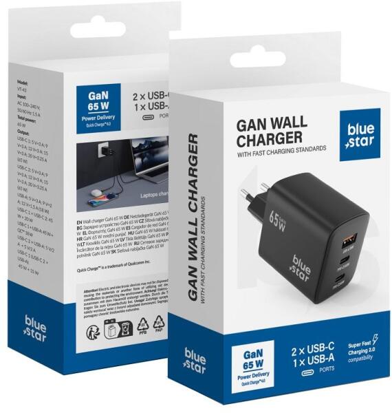 Blue Star hálózati töltő GaN technológiával, összesen 65 W teljesítménnyel. Támogatja a Quick Charge 4.0, Power Delivery és Super Fast Charging 2.0 töltési szabványokat, és lehetővé teszi mind telefonok, mind tabletek, valamint laptopok töltését. Három porttal rendelkezik – két USB-C és egy USB-A –, és lehetővé teszi három eszköz egyidejű töltését. Innovatív Ga