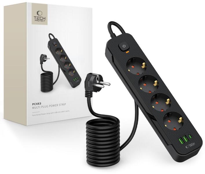 Tech- Protect PCL4X6 - 2 USB / 1 Type-C / 4 dugalj - univerzális hálózati töltő, fekete, 200 cm. A funkcionális hálózati elosztó extra USB portokkal ideális megoldás azok számára, akik többfunkciós eszközt keresnek eszközeik töltéséhez. Három hálózati aljzattal, három USB porttal és három Type-C (USB-C) porttal rendelkezik, amelyek lehetővé teszik több eszköz egyidej
