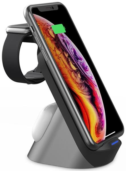 3 az 1-ben vezeték nélküli töltő: Nincs többé kusza kábel! Töltse fel qi-kompatibilis okostelefonját, induktív TWS fejhallgatóját és okosóráját ügyesen és gyorsan. Egyszerűen nyomja a készülék hátulját a töltőfelülethez, és a töltési folyamat automatikusan elindul. Összecsukható: A töltőállomás gyorsan összecsukható, ha nincs használatban, és helytakarékos