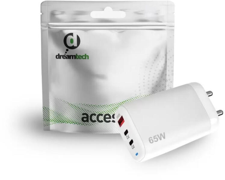 Dreamtech Charger Fehér 65W 1*USB-A, 2*USB-C hálózati gyors töltő adapter