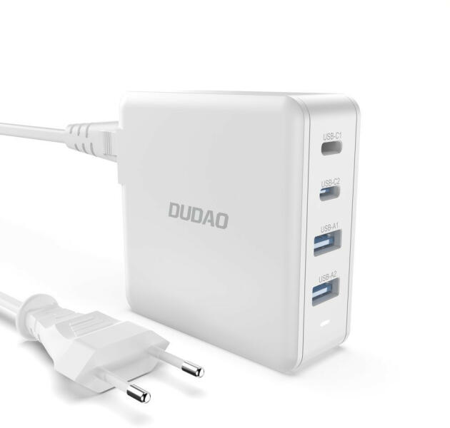 GaN 100W 2xUSB C 2xUSB Dudao A100EU gyors töltő - fehér. A Dudao hálózati töltő egy olyan technológia, amely lehetővé teszi a maximális hatékonyság, valamint a biztonság és a stabilitás elérését akár 4 eszköz egyidejű töltése esetén is. Ezzel a töltővel szinte bármilyen eszközt feltölthetsz. A töltő két USB típussal rendelkezik: USB-A és USB-C. Az eszköz kompati