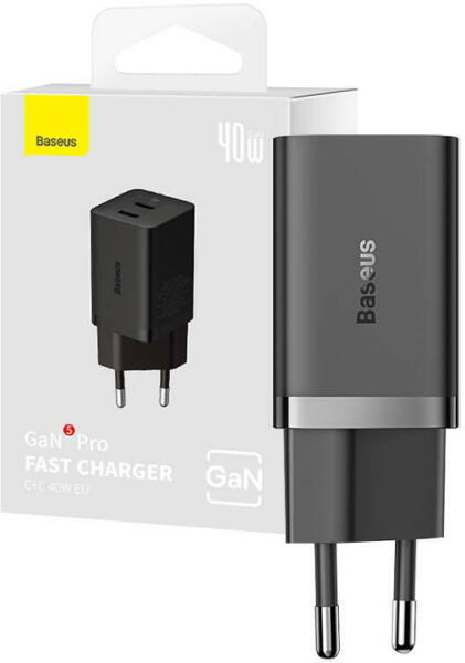 Baseus GaN5 40W töltő, 2x USB-C (fekete) Ha gyorsan szeretnéd feltölteni eszközeidet, akkor a Baseus töltő biztosan tetszeni fog neked. 2 portot kínál, és gyorsan újratölti az eszközeidet. Ráadásul a BCT technológia és a különböző biztonsági funkciók garantálják a károk elleni védelmet, a gallium-nitrid (GaN) használatának köszönhetően pedig kisebbre sikerült a tö