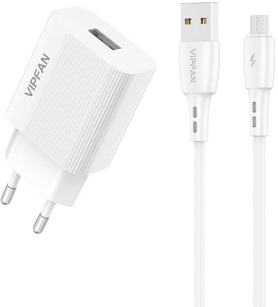 VFAN E01 hálózati töltő, 1x USB, 2,4A + Micro USB kábel (fehér) Vipfan E01 mains charger, 1x USB, 2.4A + Micro USB cable Renew your device's power quickly (2.4A) and safely with the Vipfan charger. The E01 is distinguished by its lightweight and compact design, so you can always carry it with you. It is made of fire-resistant materials, which ensures safe use. IC protection additionally affe