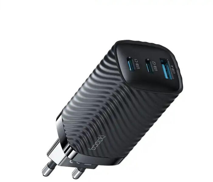 Ez a 3 portos Toocki szuper gyors töltő akár utazó adapterként is használható. Egyszerre akár 3 eszköz is tölthető egyidőben az adapterrel. Quick Charge 4.0, Power Delivery 3.0 65W Portok: 1 x USB, 2 Type-C, AC kimeneti feszültség és áram: 5V/3A; 9V/3A;12V/3A; 15V/3A; 20V/3.25A; (65W Max. ) 100-240V~50/60Hz 1,6A Max. Type-C1 Teljes kimeneti teljesítmény : 65W Védelem: Rövidzár