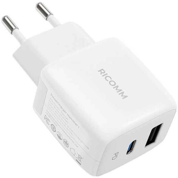 Wall Charger 25W PD Ricomm RC252 EU, 1xUSB-A, 1xUSB-C + 2.1m USB-C Cable Fali töltő 25W PD Ricomm RC252 EU, 1xUSB-A, 1xUSB-C + 2,1m USB-C kábel A Ricomm RC252 töltővel akár 2 eszközt is tölthet egyszerre. 2 porttal (1x USB-A, 1x USB-C) van felszerelve, és akár 25 W-os kimeneti teljesítményt biztosít, lenyűgöző teljesítményt biztosítva. A termék számos gyorstöltési szabványt