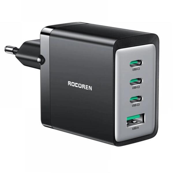 Wall charger GaN Rocoren 3x USB-C, 1x USB, 67W (black) Charge your devices even faster. The Rocoren network charger offers a power of up to 67W and supports fast charging, and it is equipped with 4 ports (3x USB-C, 1x USB-A). You can connect up to 4 devices at the same time! Moreover, the product uses advanced GaN 5 Pro technology, which combines high efficiency, compact size, and user safety. Cha