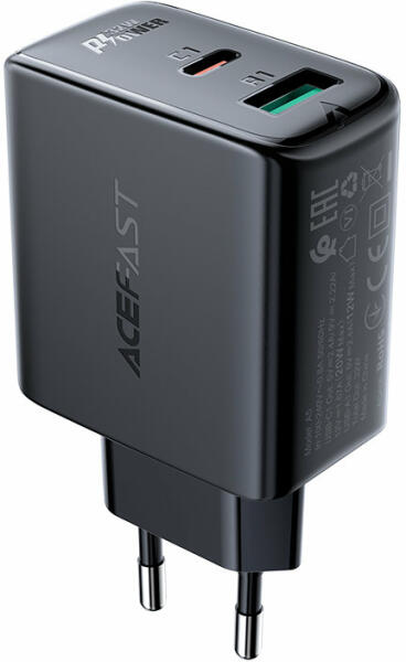 Acefast fali töltő USB Type C / USB 32W, PPS, PD, QC 3.0, AFC, FCP (A5) Acefast gyors fali töltő. Összesen 2 porttal rendelkezik, USB C típusú és USB. Az első, "C1" feliratú USB Type C csatlakozó 20W maximális teljesítményű töltést tesz lehetővé, az USB A1 csatlakozó pedig 12W-ig. Lehetővé teszi a gyorstöltést, többek között a PPS, Power Delivery, Quick Charge 3.0, AFC