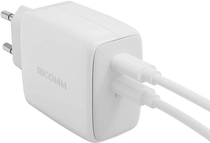 Fali töltő 65W GaN Ricomm RC652 EU, 2xUSB-C + 2,1m USB-C kábel Fali töltő 65W GaN Ricomm RC652 EU, 2xUSB-C + 2,1m USB-C kábel Mostantól kényelmesen tölthet egyszerre 2 eszközt. A Ricomm RC652 töltő 2 USB-C portot kínál, és a GaN technológiának, az akár 65W-os teljesítménynek és a különböző gyorstöltési szabványok támogatásának köszönhetően lehetővé teszi, hogy g