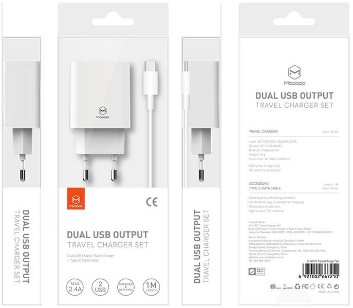 Mcdodo USB Dual Charger CH-6721 (EU) Type-C 1m Travel set (white). The Mcdodo USB Dual Charger CH-6721 is a versatile travel set that will work in any situation. Equipped with two USB ports, it allows you to charge two devices simultaneously, making it ideal for home, office and travel. Thanks to its compact design and the included 1m USB-C cable, using it is convenient and intuitive. Fast and saf