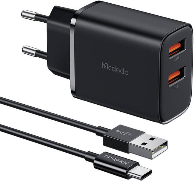 Mcdodo CH-5072 USB-A*2, 12W Power Charger + USB-A to USB-C Cable (Black) The Mcdodo CH-5072 is a powerful and versatile charger that offers 12W fast charging with two USB-A ports. Made of fire-resistant PC V0 material, it is not only safe, but also durable. Its compact dimensions of 43.08 × 27 × 85.81 mm and weight of 55 g make it easy to carry and ideal for use both at home and on the go. Fast