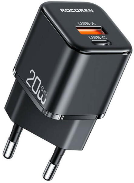 Fali töltő MiniGaN Rocoren USB-C, USB, 20W (fekete) Fali töltő MiniGaN Rocoren USB-C, USB, 20W (fekete) A Rocoren MiniGaN töltővel 2 készüléket tölthet fel nagyon rövid idő alatt. A termék 2 portot kínál (USB-A és USB-C), maximális kimeneti teljesítménye 20 W. Támogatja a különféle gyorstöltési szabványokat is, és kiemelkedik könnyű, kompakt kialakításával, lehetőv