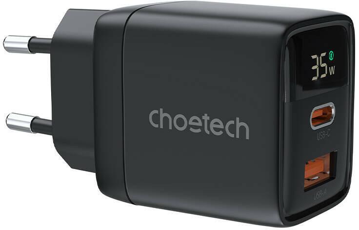 GAN3 USB-A USB-C PD35W power charger Choetech PD6052 (black) Choetech PD6052 stands out for its efficient performance and compact design - perfect for everyday use. What's more, it allows you to charge 2 devices at the same time thanks to its USB-C and USB-A ports, and support of fast charging protocols allows you to renew your equipment's power faster. Charge 2 devices simultaneously Thanks to it
