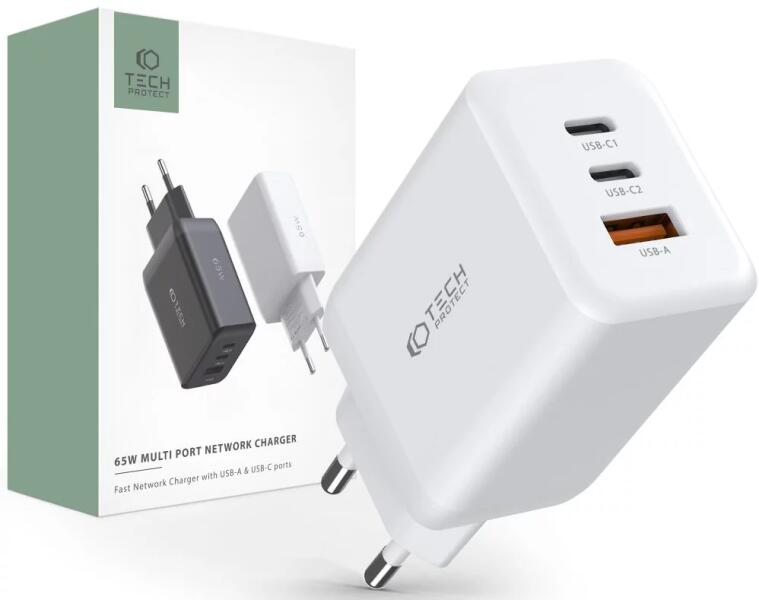 A Tech-Protect C65W univerzális hálózati töltő tökéletes megoldás a különböző típusú készülékek, például okostelefonok, hordozható konzolok, powerbankok vagy tabletek energiájának gyors és biztonságos megújítására. Ez a töltő két USB-C porttal (PD65W) és egy USB-A porttal (QC3.0) rendelkezik , így három eszköz egyidejű töltését teszi lehetővé. A Power Deliv
