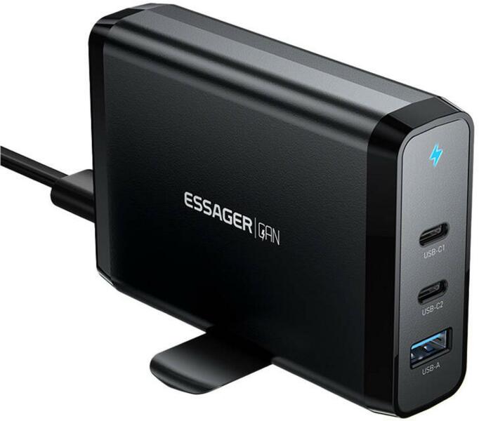 Essager GaN 140W 2xUSB-C 1xUSB-A Wall Charger (Black) This charger is equipped with 3 output ports (x2 USB-C, x1 USB-A) and provides 140W of power, allowing for fast device charging. The use of GaN technology ensures product efficiency, while compatibility with various fast charging protocols increases flexibility in usage. With the retractable base, you can position the charger both vertically an