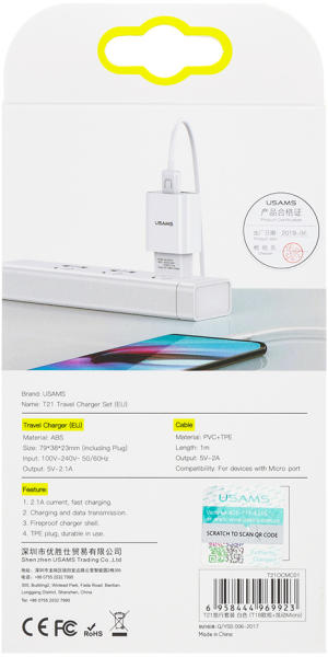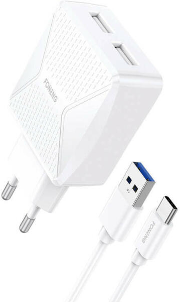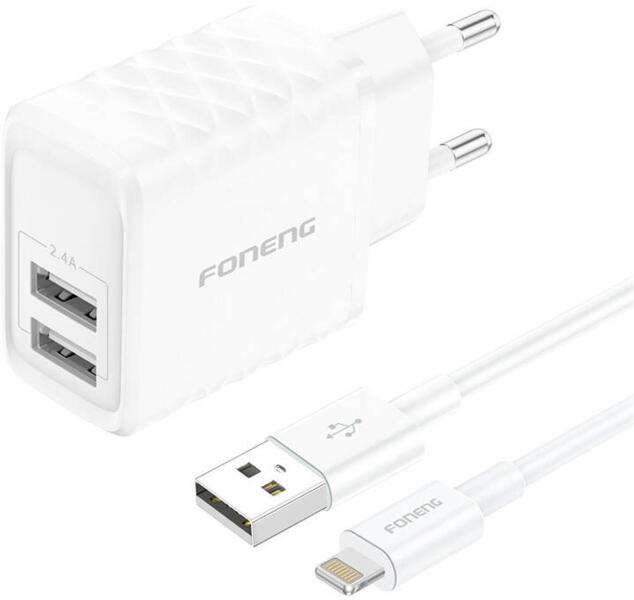 Foneng EU35 Lightning, USB 2.4A power charger (white). The Foneng EU35 allows you to quickly charge two devices simultaneously. Its unique, sleek design sets it apart from the rest, and its intelligent recognition circuit guarantees smooth and safe power supply. ABS PC construction makes the charger fireproof and effectively dissipates heat, and its wide voltage range of 100-240V makes it a univer