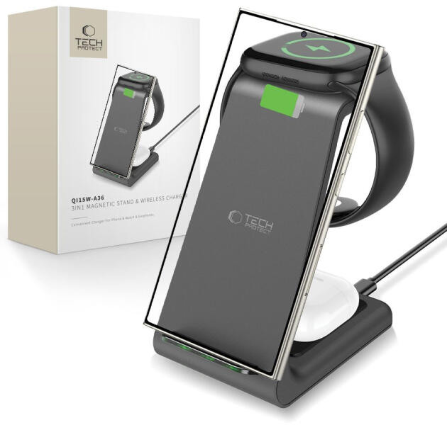 TECH-PROTECT QI15W-A36 3IN1 WIRELESS CHARGER FOR ANDROID asztali vezeték nélküli töltő android készülékekhez, fekete Tech-Protect QI15W-A36 to nowoczesna, bezprzewodowa stacja ładująca 3w1, która zapewnia szybkie i bezpieczne ładowanie aż trzech urządzeń jednocześnie. Dzięki szerokiej kompatybilności pozwala na wygodne ładowanie smartfonów z systemem Android, a także bezprzewo