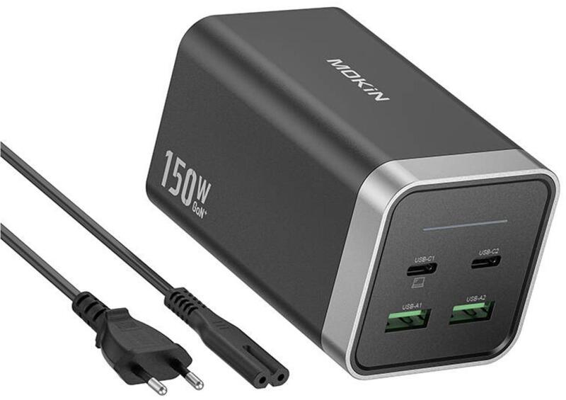 MOKiN PD150W 2xUSB-C 2xUSB-A network charger (black). Charge up to four devices simultaneously and save time. The MOKiN network charger offers four ports (2x USB-A, 2x USB-C), and its maximum total output power reaches up to 150 watts. It is also distinguished by its wide compatibility and compact design - you can always have it at hand. Impressive power With the MOKiN charger, charging takes less