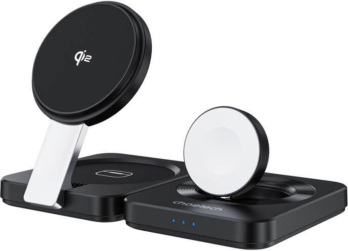 Choetech Qi2 összecsukható 3 az 1-ben mágneses töltő A Choetech Qi2 összecsukható mágneses töltő egy minden egyben megoldás az Apple-eszközök felhasználói számára, akik egyszerre szeretnék tölteni iPhone-jukat, Apple Watch-ukat és AirPods-ukat. A Qi2 technológia támogatásával és 5 watt és 15 watt közötti töltési teljesítményével egyszerre három eszköz gyors és b