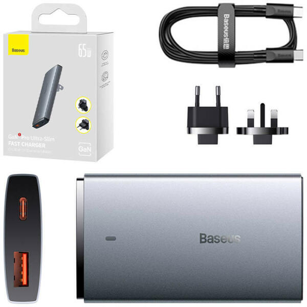 Baseus GaN5 Töltő 65W + USB-C + USB-A Baseus GaN5 mains charger, 65W, 1x USB-C port, 1XUSB-A Do you want to charge your devices conveniently and quickly? Thanks to the Baseus GaN5 mains charger, this will be possible. It offers 2 fast charging ports, thanks to which your equipment will be charged in no time. What's more, thanks to its slim design, you can connect it to hard-to-reach contacts, su