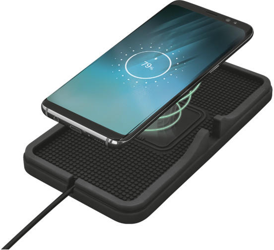 Trust Flexo wireless fekete autós QI töltő - automatikusan tölti a telefont a tartóba helyezéskor - 5 W-os vezeték nélküli töltő, kapcsolt USB kábellel - bármilyen 2A/10W autós töltőhöz kapcsolható - rugalmas gumiból készült, mely követi a műszerfal vonalát - az eszköz szélei nem engedik a telefon elmozdulását vezetés közben - álló pozícióba is tehető, melyben a