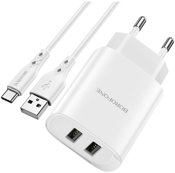 Hálózati USB töltő adapter, 2x USB aljzattal KImeneti feszültség: 5V / 2.1A Méret: 85 * 43 * 26mm Súly: 63.5g PC anyaghasználattal Egyszerre két eszköz töltésére is alkalmas Tartozék USB Type-C kábellel