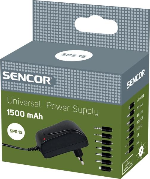 SENCOR SPS 15 univerzális tápegység 1500 mA 35043731 Univerzális tápegység 1500 mA Univerzális hálózati adapter 1500 mA, stabilizált Megfelel az EU legfrissebb EKO szabványainak Alacsony felszállás készenléti állapotban Védett a rövidzárlat ellen Védett túlfeszültség és túlmelegedés ellen Elforgatható polaritás és kimeneti feszültség Kimeneti áram: 1500 mA-ig (a tel