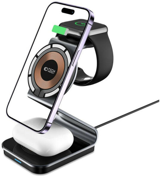 A Tech-Protect QI15W-A29 egy sokoldalú 3 az 1-ben töltő , amely számos funkciót és kényelmes használatot kínál. Ennek a töltőnek az egyik fő előnye, hogy egyszerre akár három készüléket is képes táplálni. Ennek köszönhetően többé nem kell aggódnia a MagSafe rendszerrel ellátott okostelefonja, az Apple Watch és a vezeték nélküli töltési funkcióval rendelkező fej