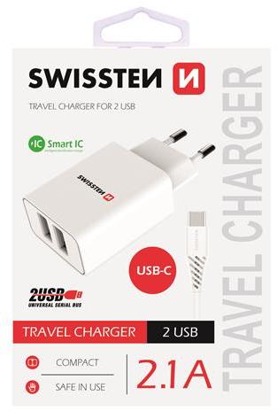 Swissten hálózati töltő adapter, 2,1 A, fehér színben. A termék 2 USB porttal rendelkezik, így alkalmas 2 készülék egy időben történő töltésére. Smart IC technológiájának köszönhetően a rendszer osztja el a rendelkezésre álló áramot a csatlakoztatott készülékek között. Ezenkívül a Smart töltő felismeri a szükséges áramot eszközönként is. Okostelefonod, ta