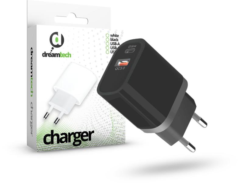 Univerzális két kimenettel Type-C és + USB-A rendelkező hálózati töltőfej. 20Wattos gyorstöltésre alkalmas teljesítménnyel, fekete színben, a képen látható csomagolásban. Akár 50% -ot tölt 30 perc alatt a kompatibilis telefonokon. Túlfeszültség elleni védelemmel ellátva. Iphone 12 kompatibilis!