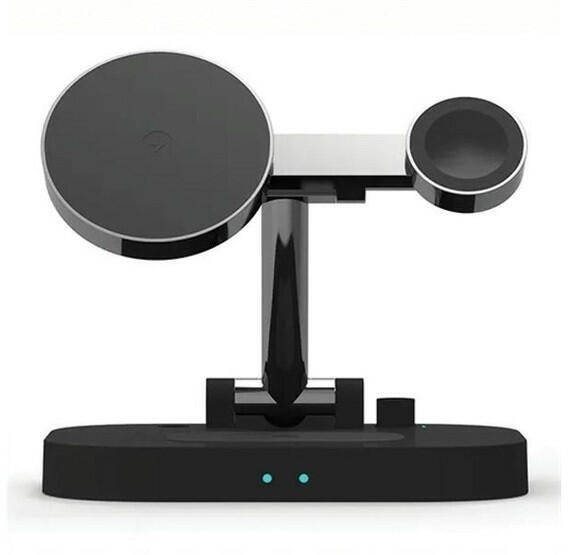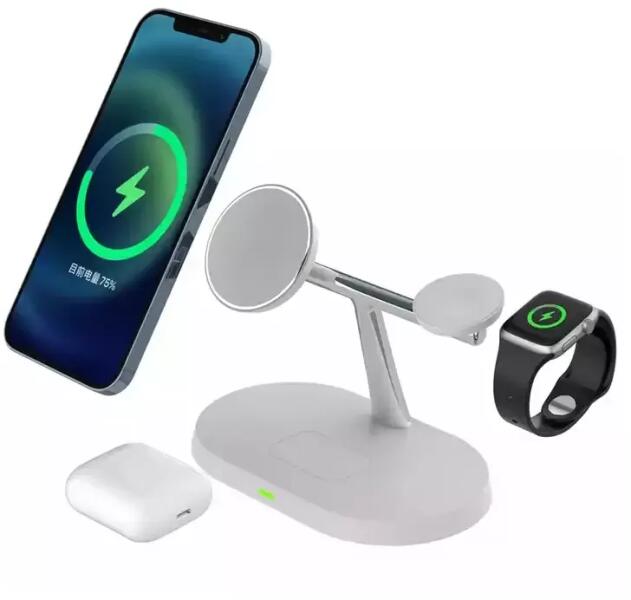 3in1 MagSafe QI vezeték nélküli töltőállvány QC 15W fehér Ez a 3in1 mágneses töltőállvány a töltés új korszaka. Vezeték nélküli gyorstöltő, amellyel egyszerre három készülék is hatékonyan tölthető (mobiltelefon / fülhallgató / okosóra). Cinkötvözetből készült, csúcsminőségű anyagok és gyönyörű dizájn. Tulajdonságai: -15W-os vezeték nélküli gyorstöl
