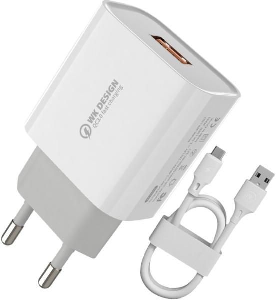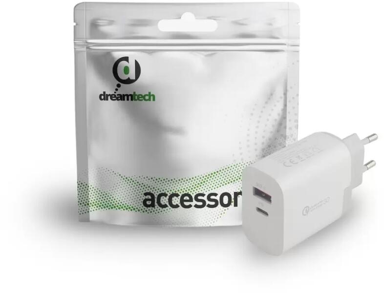 Dreamtech USB-C+A töltőfej 30W + QC3.0 teljesítménnyel, fehér színben, a képen látható csomagolásban.