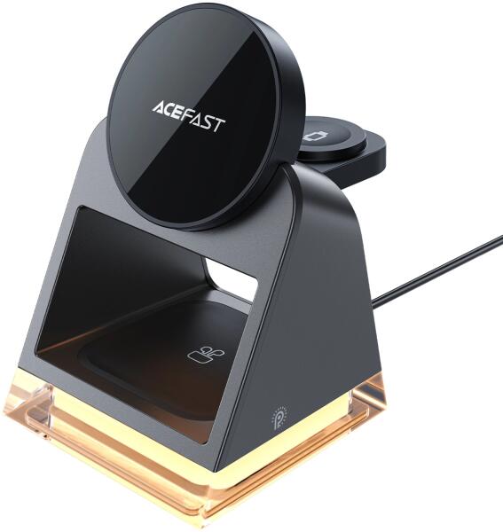 3in1 Acefast E17 induktív töltő, kompatibilis a MagSafe rendszerrel, 15W + USB-A - USB-C kábel - fekete Az elegáns és modern Acefast E17 induktív töltővel egyszerre három készüléket tölthetsz. Akár 15 W-os teljesítménnyel működik. Elegendő helyet biztosít ahhoz, hogy minden eszköze mindig feltöltve és használatra készen álljon. A megvilágított elemek révén az Acefast