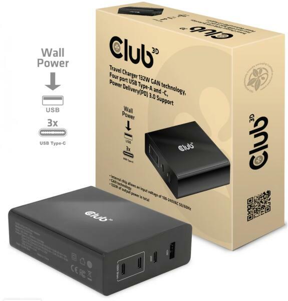 Club3D 132W GAN technology, 4 port USB Type-A and -C, Power Delivery(PD) 3.0 Support - Travel Charger A Club 3D CAC-1906 Travel Charger 132W GAN technológia, négyportos USB Type-A és -C, Power Delivery (PD) 3.0 támogatás. Ez a termék egy nagy teljesítményű, kis súlyú utazó töltõ, amelynek maximális kimeneti teljesítménye 132 W. A 3 DB USB Type-C porttal és 1 Type-A porttal felsze