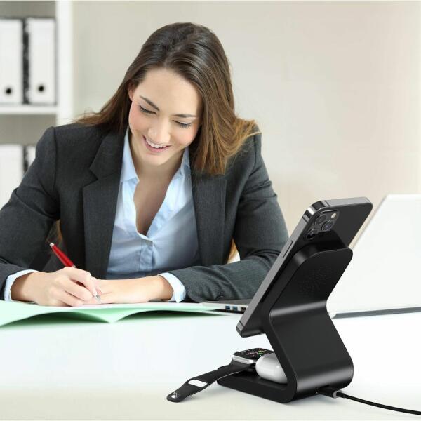 3 az 1-ben vezeték nélküli töltő. Lehetővé teszi telefonja, okosórája és fülhallgatóinak induktív töltését. Támogatja a MagSafe töltést. Legfeljebb 15 W teljesítményigényű készülékekhez tervezve. Töltsön több eszközt egyetlen tartozékkal! Ezzel sok helyet takaríthat meg, mert csak egyetlen tartozékot fog használni az összes eszköz töltésére. A termék ABS- b